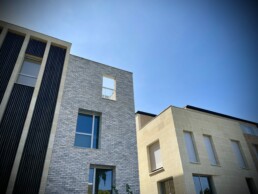Un léger décaissé et des retraits de façade viennent limiter la perception de hauteur des bâtiments et ouvrent la perspective de la rue. Le traitement des pignons, as­suré au moyen de décrochés donne également une lecture cohérente avec les constructions environnantes. Un travail sur le séquençage des volumes de fa­çade est également proposé : Sur la rue, les lar­geurs d’éléments bâtis s’échelonnent de 4.5 à 8 m. Les linéaires de façade sont réduits afin de s’intégrer plus aisément avec celles des maisons et avec le caractère intimiste et résidentiel de la rue Melle Mars.